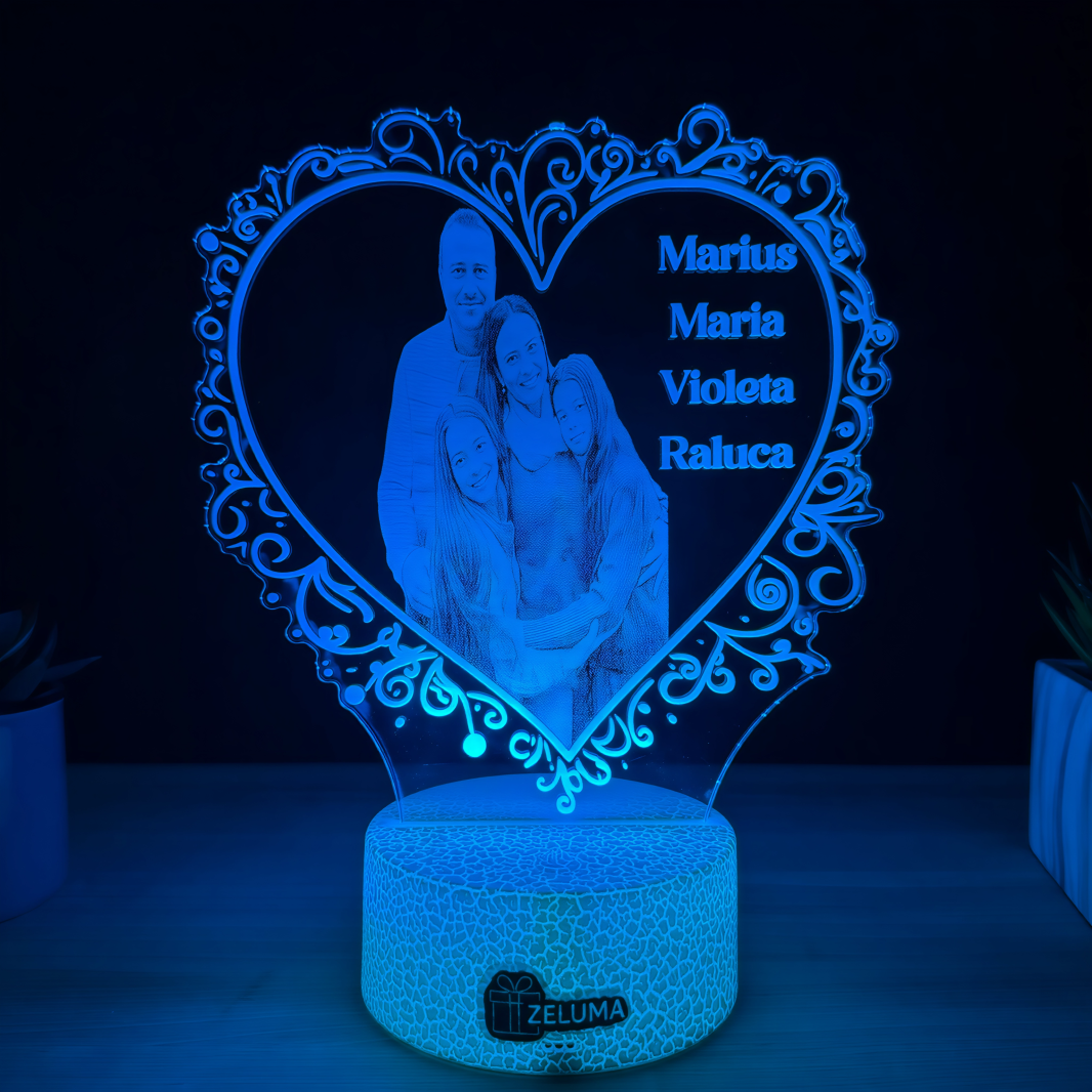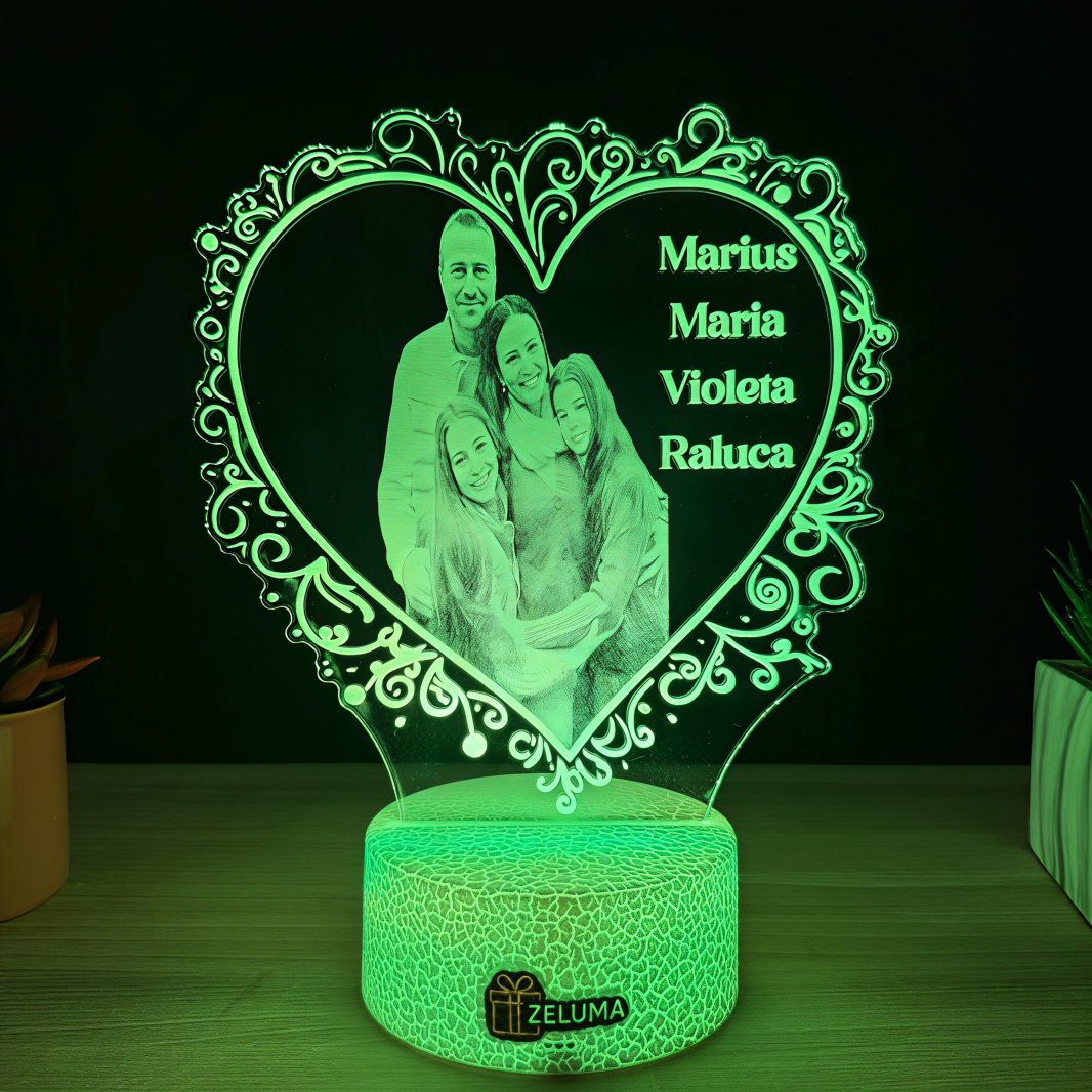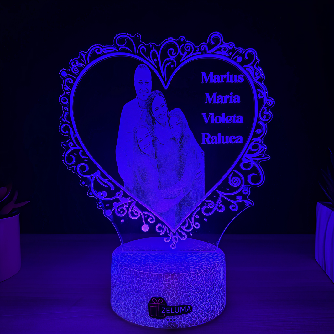 ✨ Personalizata cu poza si numele membrilor familiei, aceasta lampa 3D devine o piesa de decor plina de caldura si emotie. Un cadou perfect pentru parinti, bunici sau pentru propria casa, menit sa lumineze nu doar o incapere, ci si sufletul.