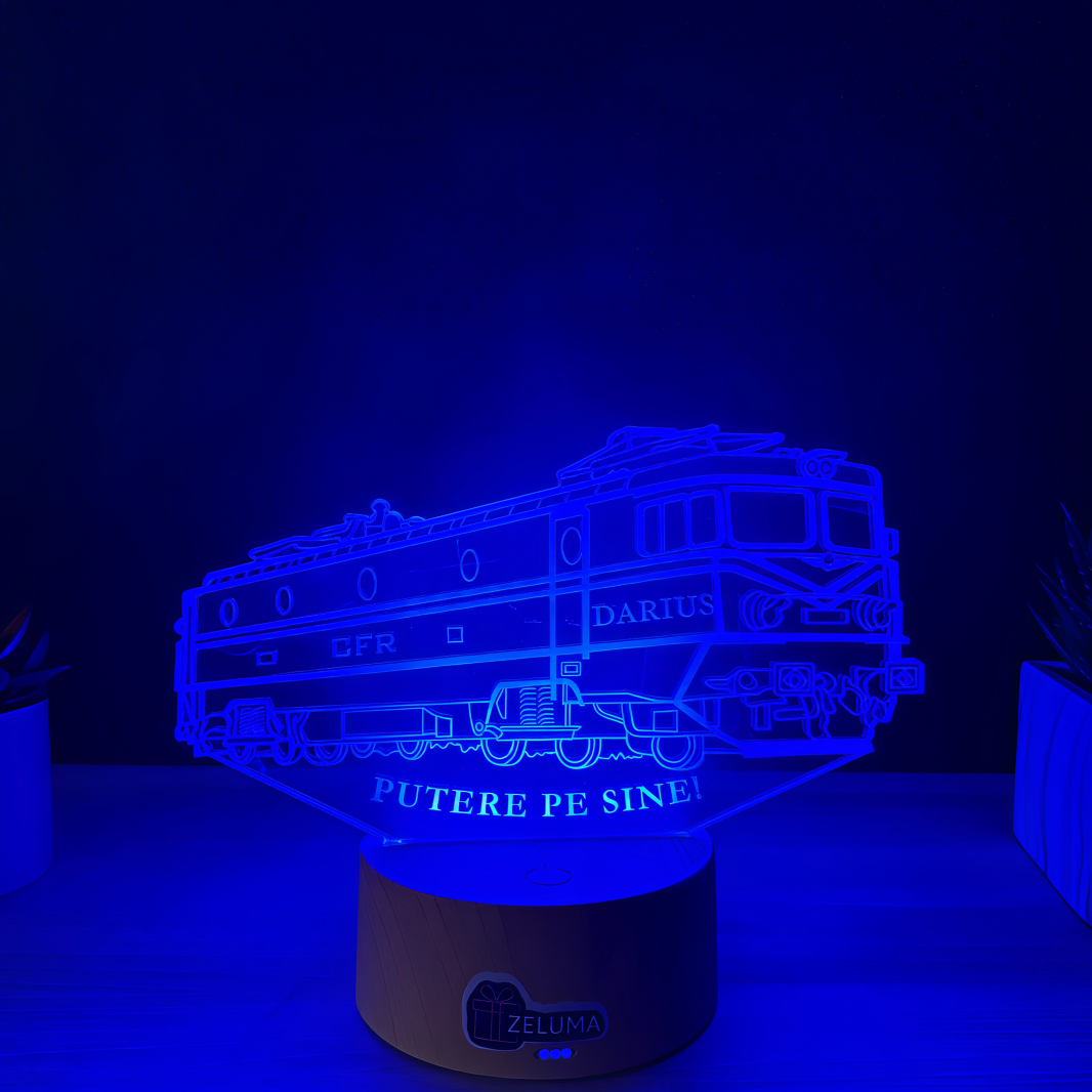 Un model dedicat pasionatilor de trenuri si profesioniștilor din domeniul feroviar! Aceasta lampa 3D personalizata reproduce in detaliu o locomotiva CFR, completata cu numele Darius si motto-ul Putere pe sine! – un simbol al fortei, determinarii si preciziei.