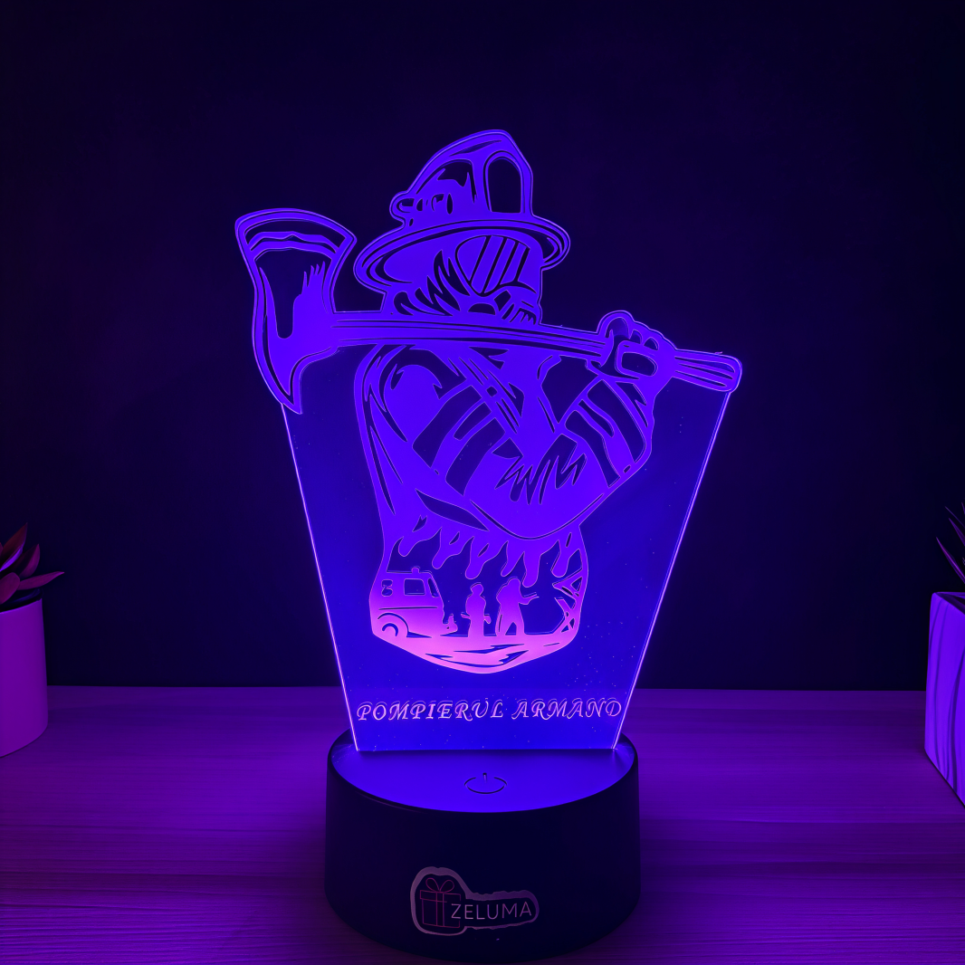 Un simbol al curajului si al devotamentului fata de viata! Aceasta lampa 3D personalizata ilustreaza un pompier in actiune, cu toporul pe umar si flacarile in fundal – imaginea perfecta a eroismului zilnic. Gravata cu numele Pompierul Armand, devine o piesa unica, plina de forta si semnificatie.