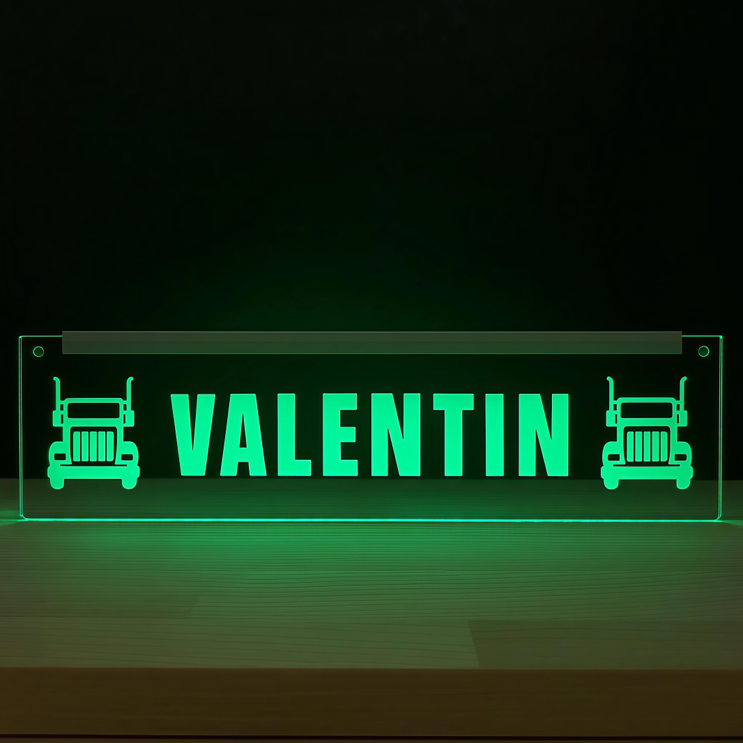 🚛 Placheta din plexiglas gravat, realizata special pentru soferii de TIR care vor sa adauge o nota personala camionului lor. Fie ca alegi un mesaj clasic sau unul personalizat, placheta lumineaza spectaculos si pune in valoare fiecare detaliu al designului.