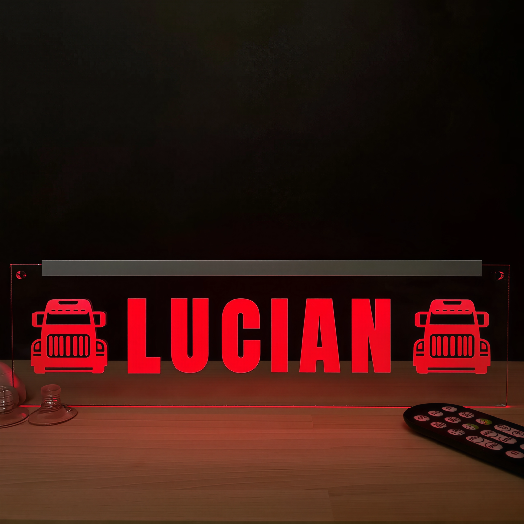 🚛 Placheta din plexiglas gravat, realizata special pentru soferii de TIR care vor sa adauge o nota personala camionului lor. Fie ca alegi un mesaj clasic sau unul personalizat, placheta lumineaza spectaculos si pune in valoare fiecare detaliu al designului.