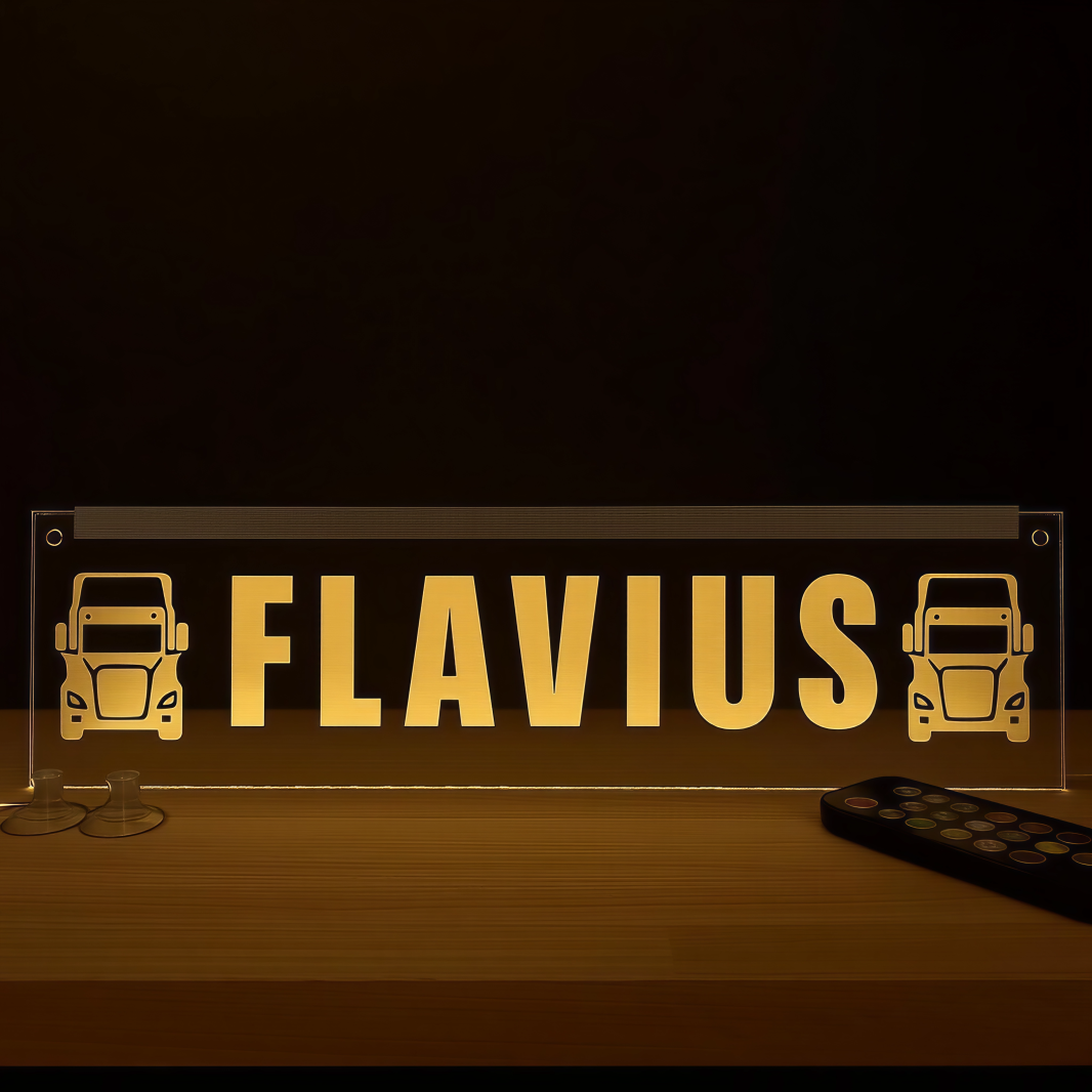 🚛 Placheta din plexiglas gravat, realizata special pentru soferii de TIR care vor sa adauge o nota personala camionului lor. Fie ca alegi un mesaj clasic sau unul personalizat, placheta lumineaza spectaculos si pune in valoare fiecare detaliu al designului.
