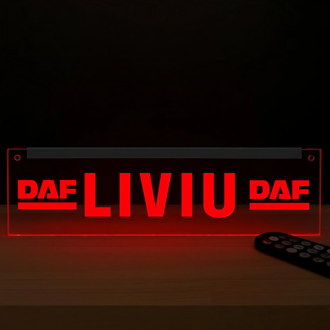 🚛 Placheta din plexiglas gravat, realizata special pentru soferii de TIR care vor sa adauge o nota personala camionului lor. Fie ca alegi un mesaj clasic sau unul personalizat, placheta lumineaza spectaculos si pune in valoare fiecare detaliu al designului.
