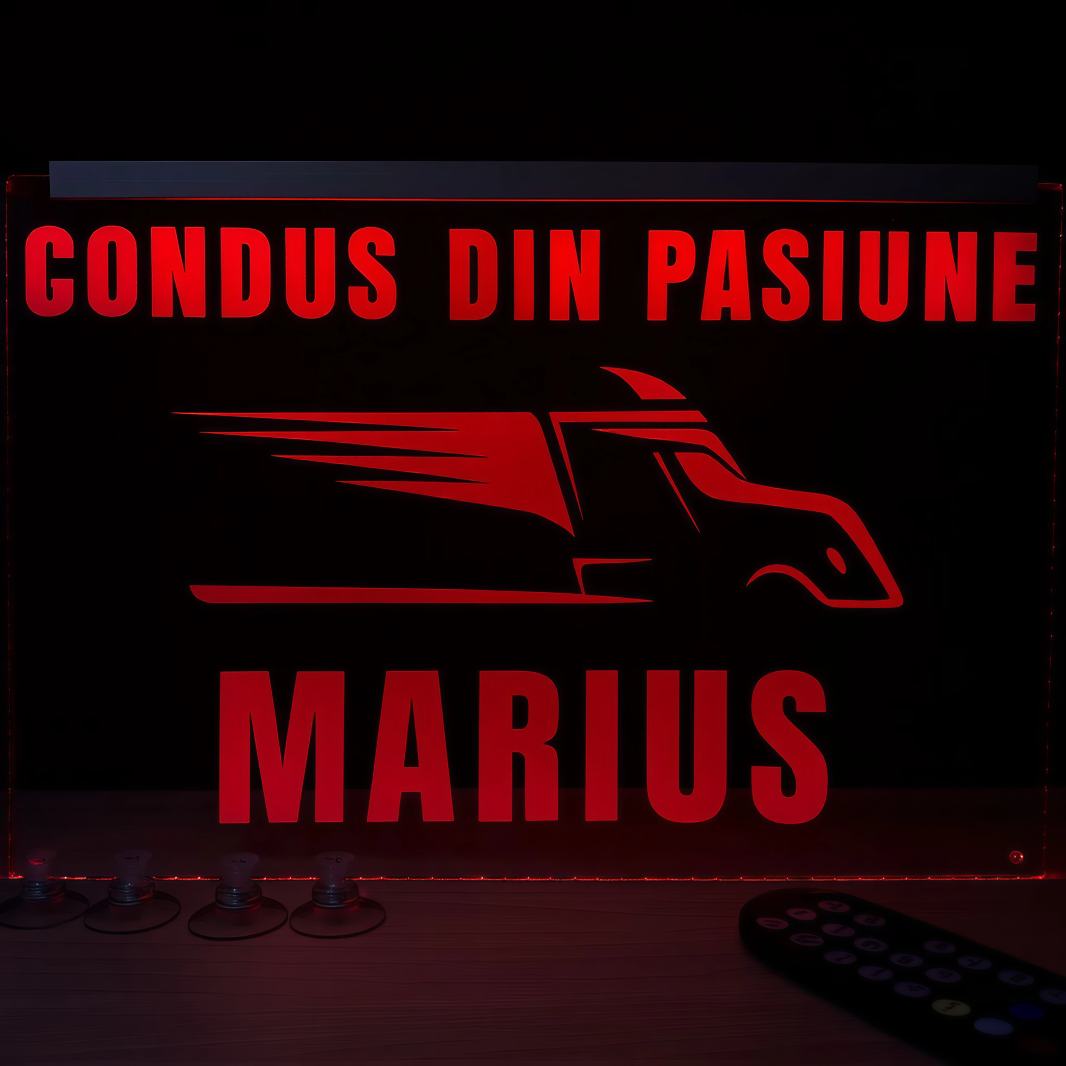 🚛 Placheta din plexiglas gravat, realizata special pentru soferii de TIR care vor sa adauge o nota personala camionului lor. Fie ca alegi un mesaj clasic sau unul personalizat, placheta lumineaza spectaculos si pune in valoare fiecare detaliu al designului.