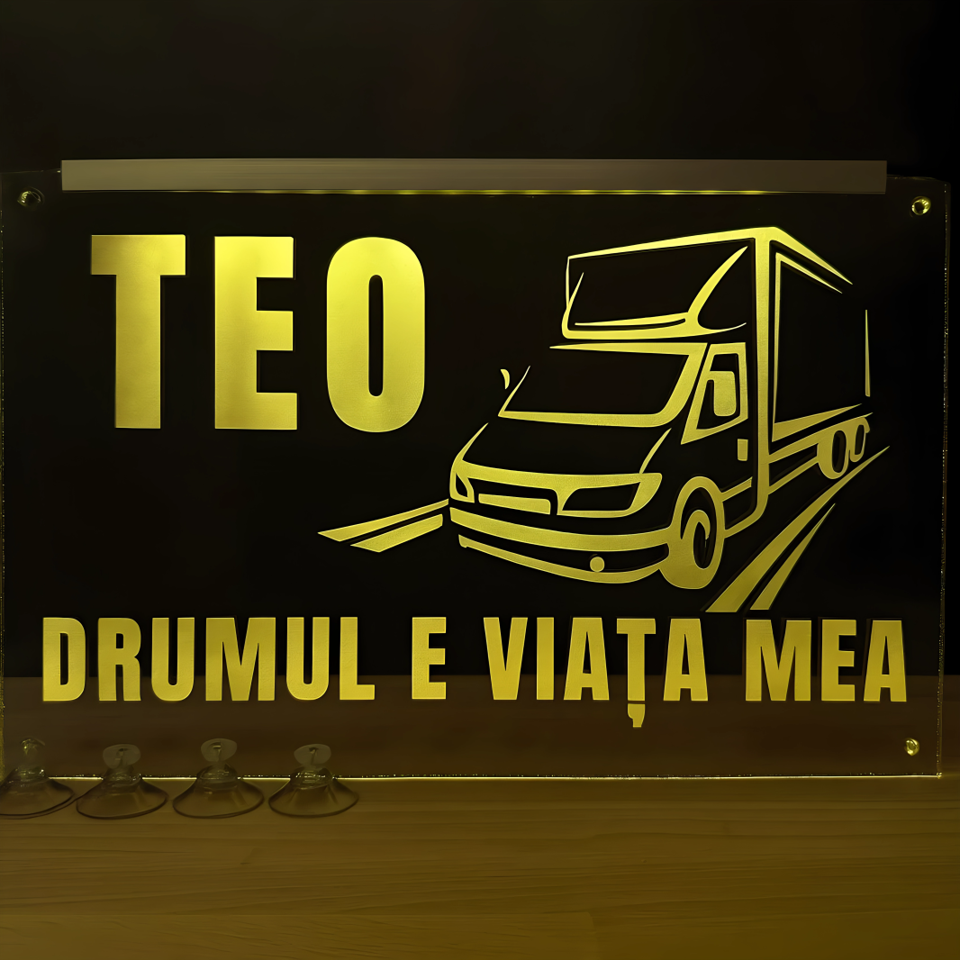 🚛 Placheta din plexiglas gravat, realizata special pentru soferii de TIR care vor sa adauge o nota personala camionului lor. Fie ca alegi un mesaj clasic sau unul personalizat, placheta lumineaza spectaculos si pune in valoare fiecare detaliu al designului.