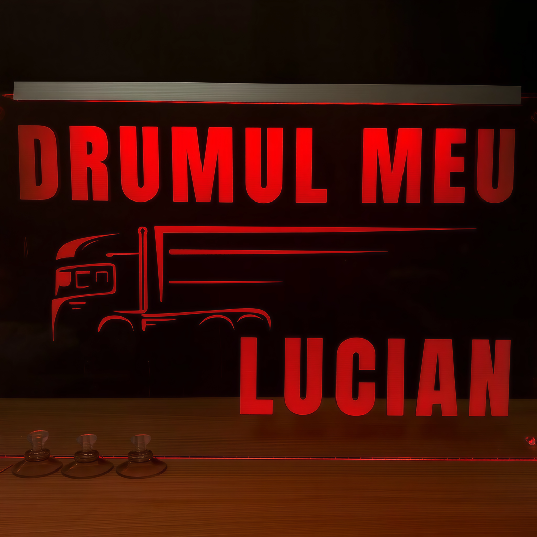🚛 Placheta din plexiglas gravat, realizata special pentru soferii de TIR care vor sa adauge o nota personala camionului lor. Fie ca alegi un mesaj clasic sau unul personalizat, placheta lumineaza spectaculos si pune in valoare fiecare detaliu al designului.