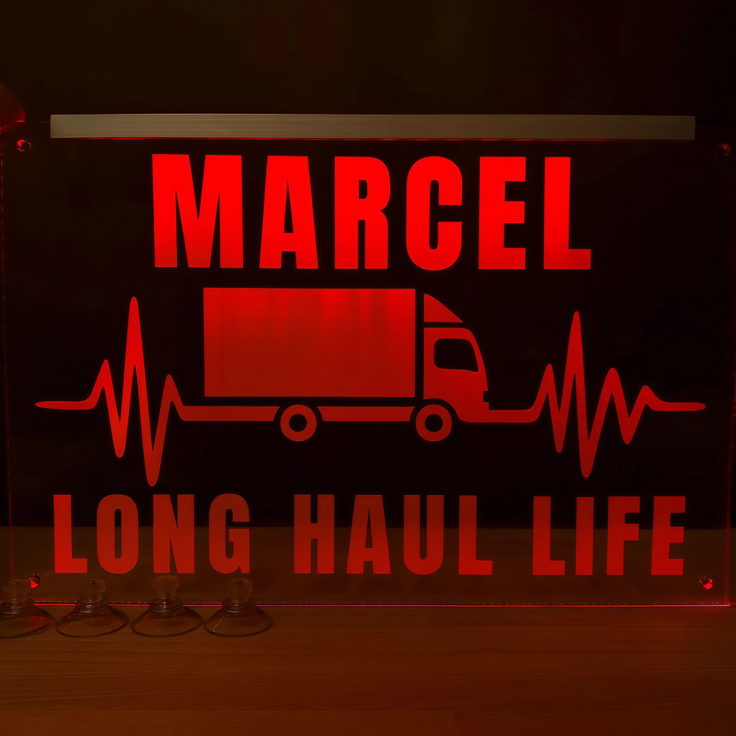 🚛 Placheta din plexiglas gravat, realizata special pentru soferii de TIR care vor sa adauge o nota personala camionului lor. Fie ca alegi un mesaj clasic sau unul personalizat, placheta lumineaza spectaculos si pune in valoare fiecare detaliu al designului.