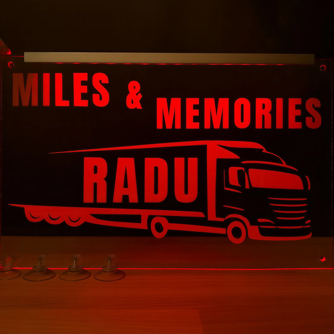 🚛 Placheta din plexiglas gravat, realizata special pentru soferii de TIR care vor sa adauge o nota personala camionului lor. Fie ca alegi un mesaj clasic sau unul personalizat, placheta lumineaza spectaculos si pune in valoare fiecare detaliu al designului.