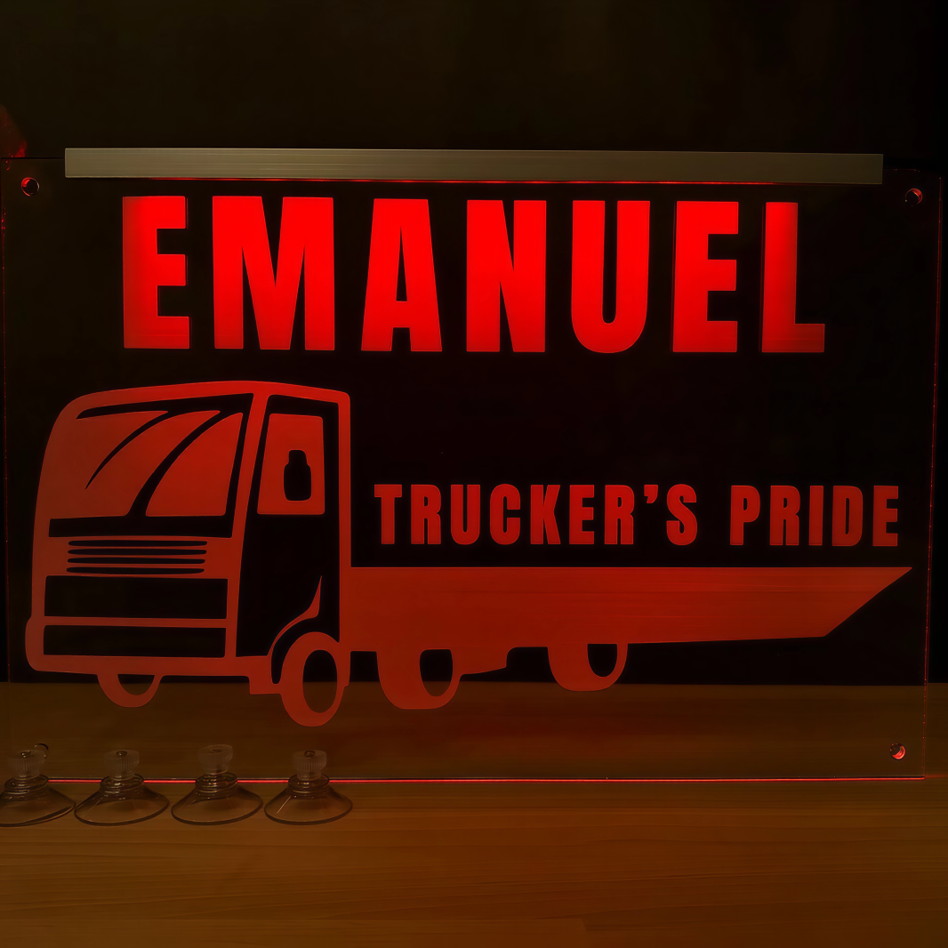 🚛 Placheta din plexiglas gravat, realizata special pentru soferii de TIR care vor sa adauge o nota personala camionului lor. Fie ca alegi un mesaj clasic sau unul personalizat, placheta lumineaza spectaculos si pune in valoare fiecare detaliu al designului.