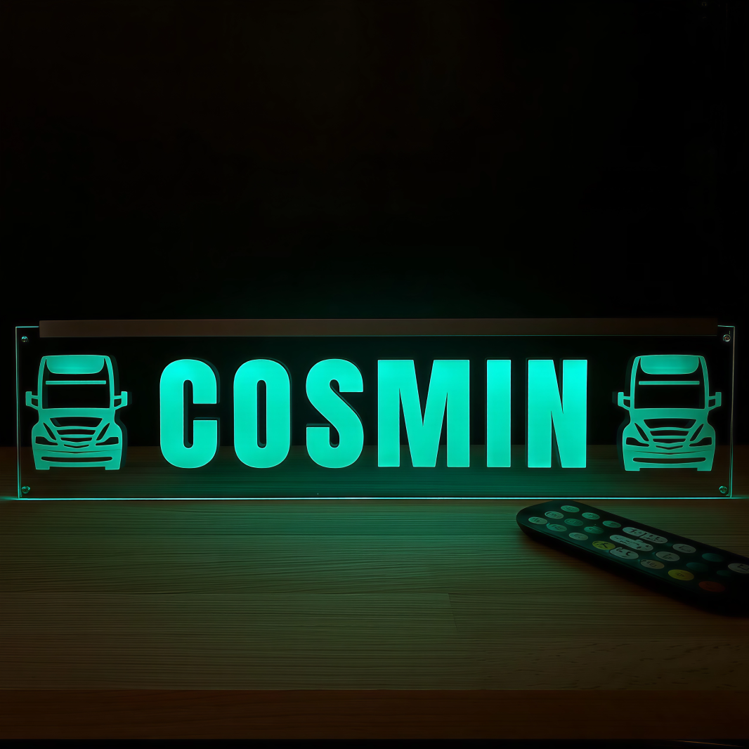 🚛 Placheta din plexiglas gravat, realizata special pentru soferii de TIR care vor sa adauge o nota personala camionului lor. Fie ca alegi un mesaj clasic sau unul personalizat, placheta lumineaza spectaculos si pune in valoare fiecare detaliu al designului.